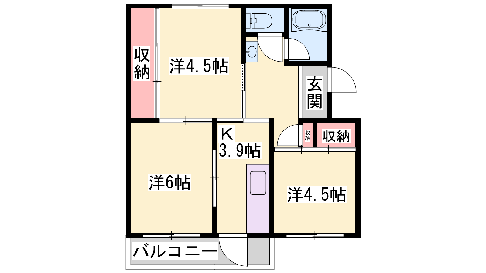 - K3.9帖、洋室6帖、洋室4.5帖、洋室4.5帖