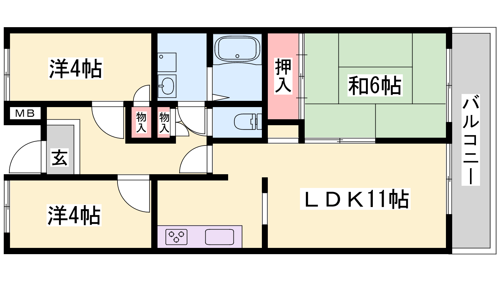 - LDK11帖、和室6帖、洋室4帖、洋室4帖