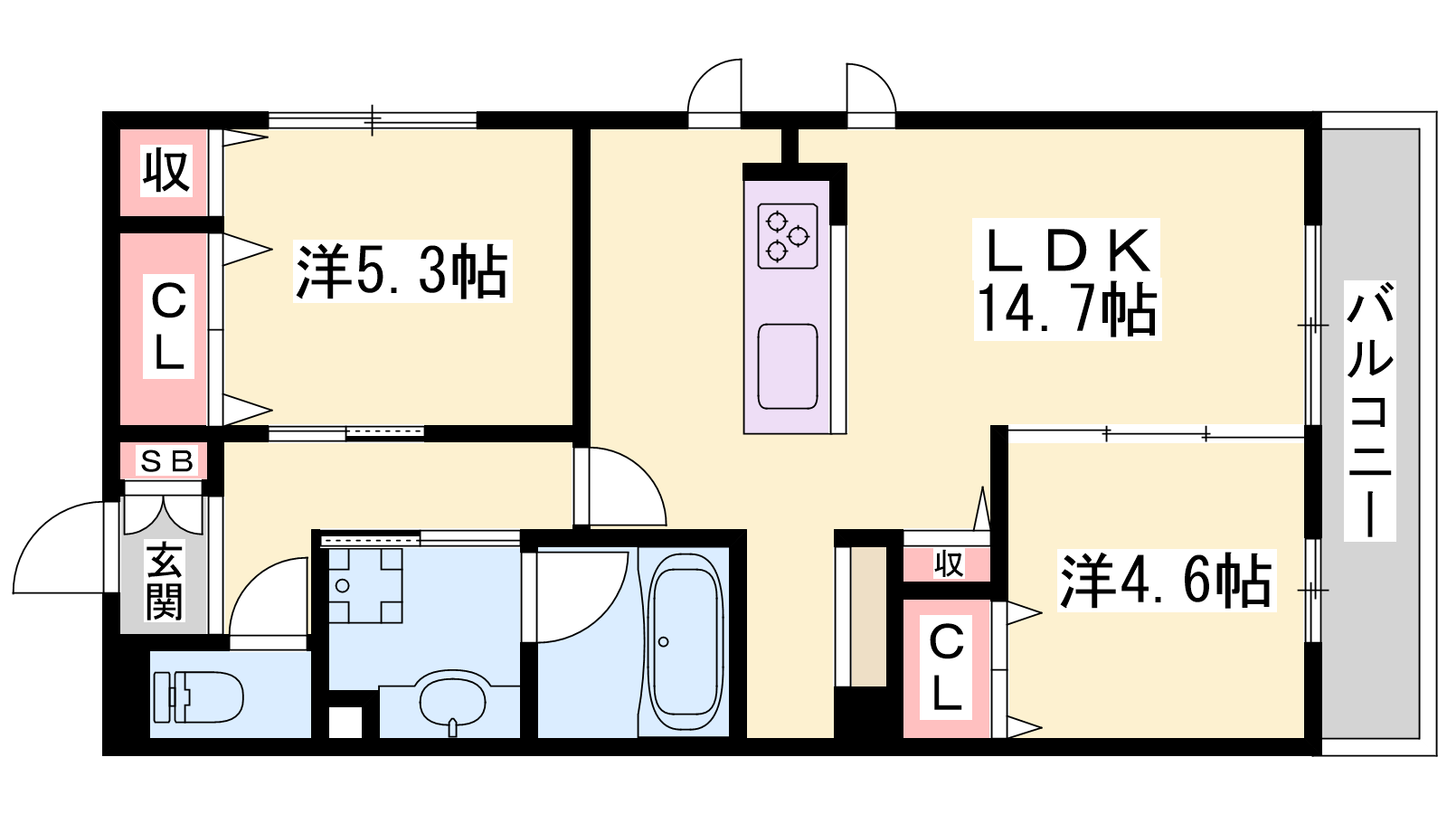 - LDK14.7帖、洋室5.3帖、洋室4.6帖