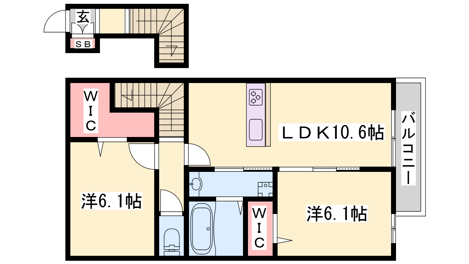 - LDK10.7帖、洋室6.1帖、洋室4.6帖