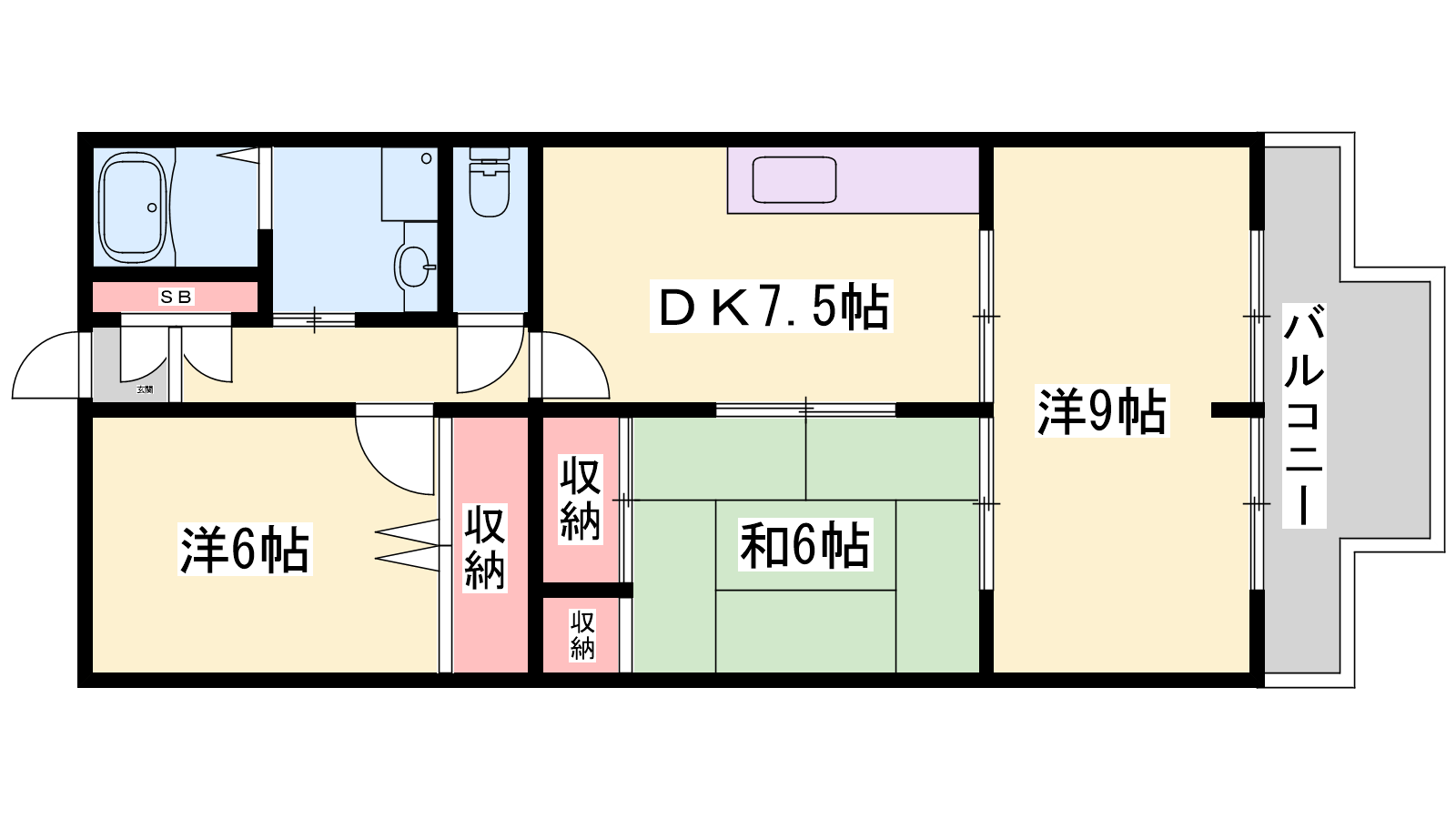 - DK7.5帖、洋室9帖、洋室6帖、和室6帖