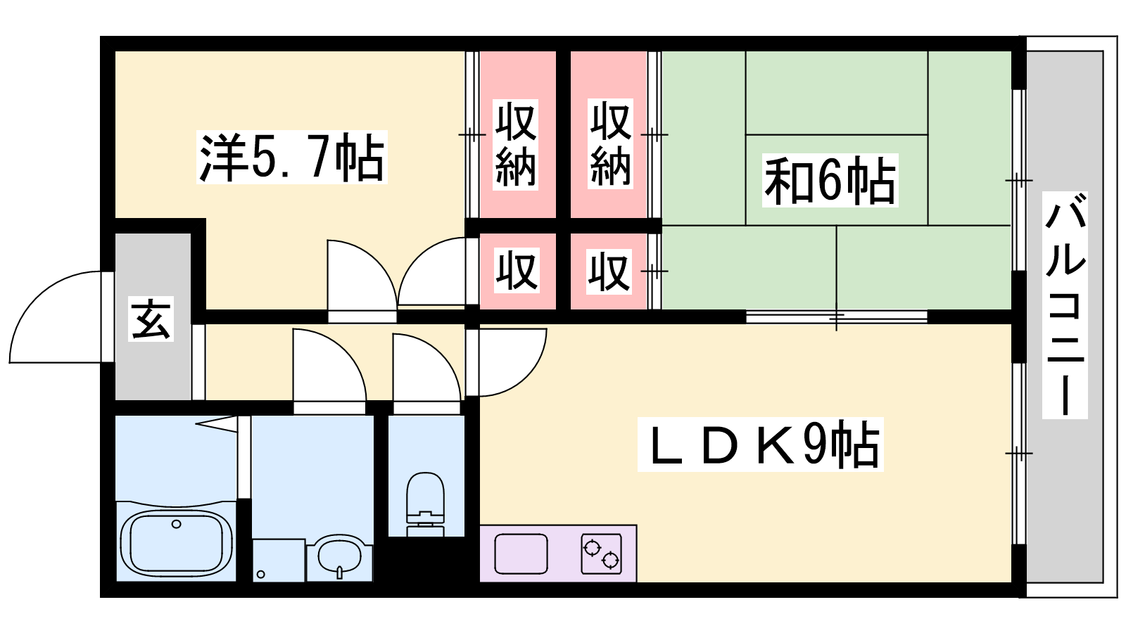 - LDK9帖、洋室5.7帖、和室6帖