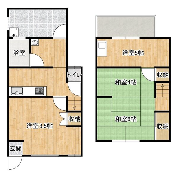 - K4帖、和室6帖、和室4帖、洋室8.5帖、洋室5帖