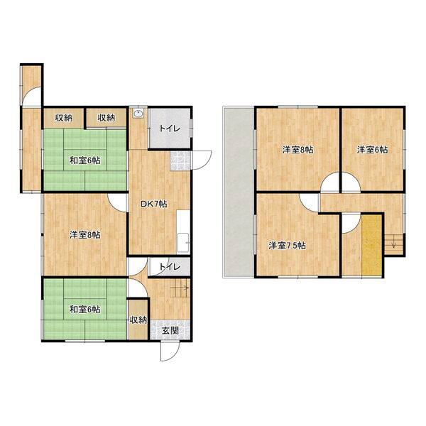 - DK7帖、洋室8帖、洋室8帖、洋室7.5帖、洋室6帖、洋室6帖、洋室6帖、洋室6帖
