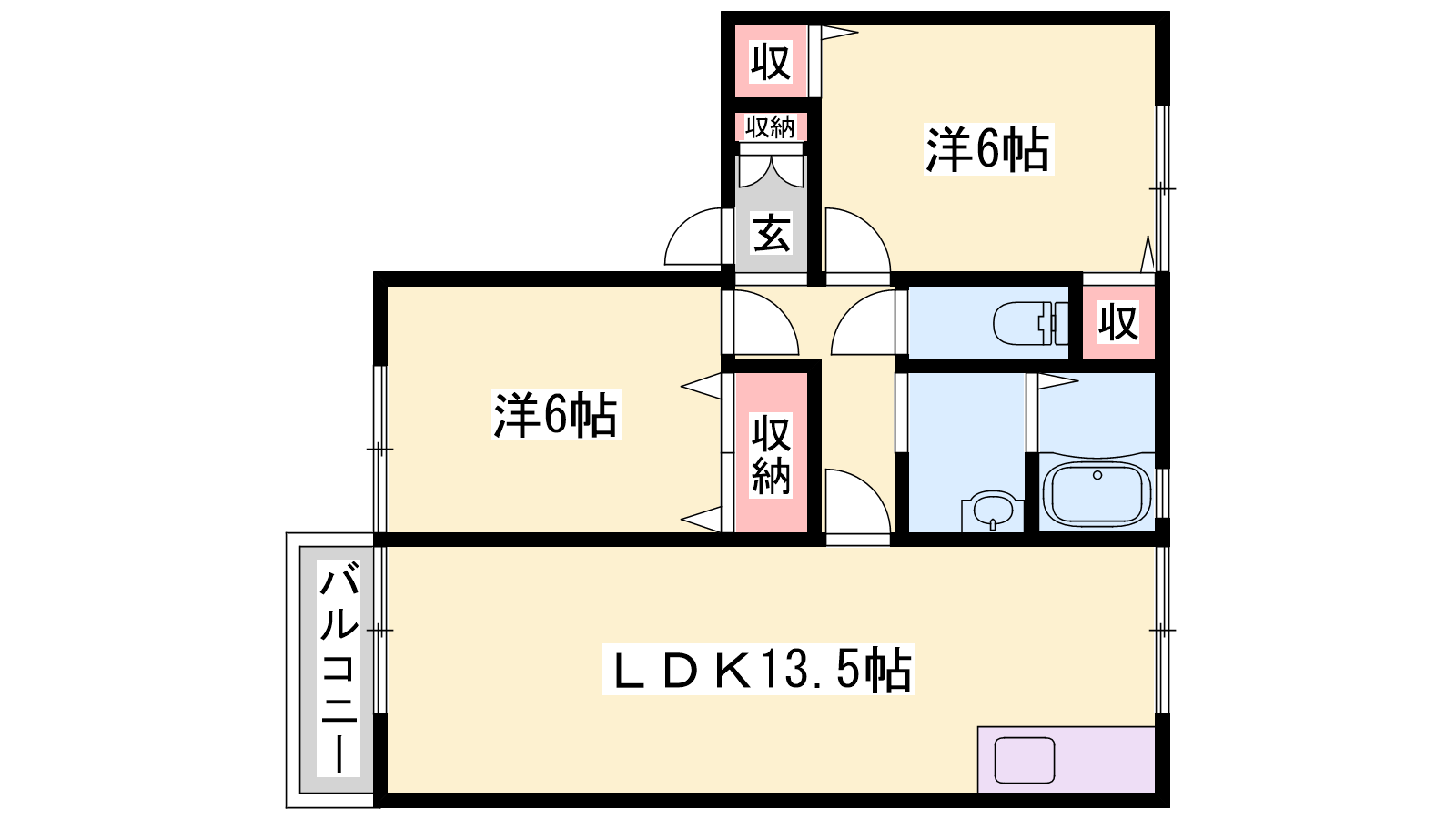 - LDK13.5帖、洋室6帖、洋室6帖