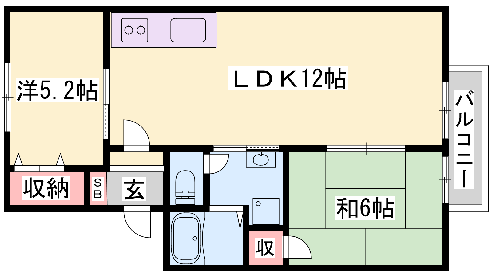 - LDK12帖、和室6帖、洋室5.2帖