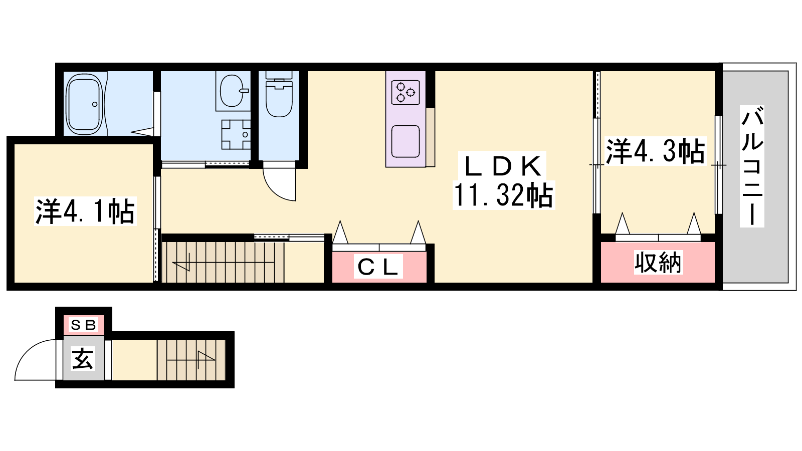 - LDK11.32帖、洋室4.3帖、洋室4.1帖