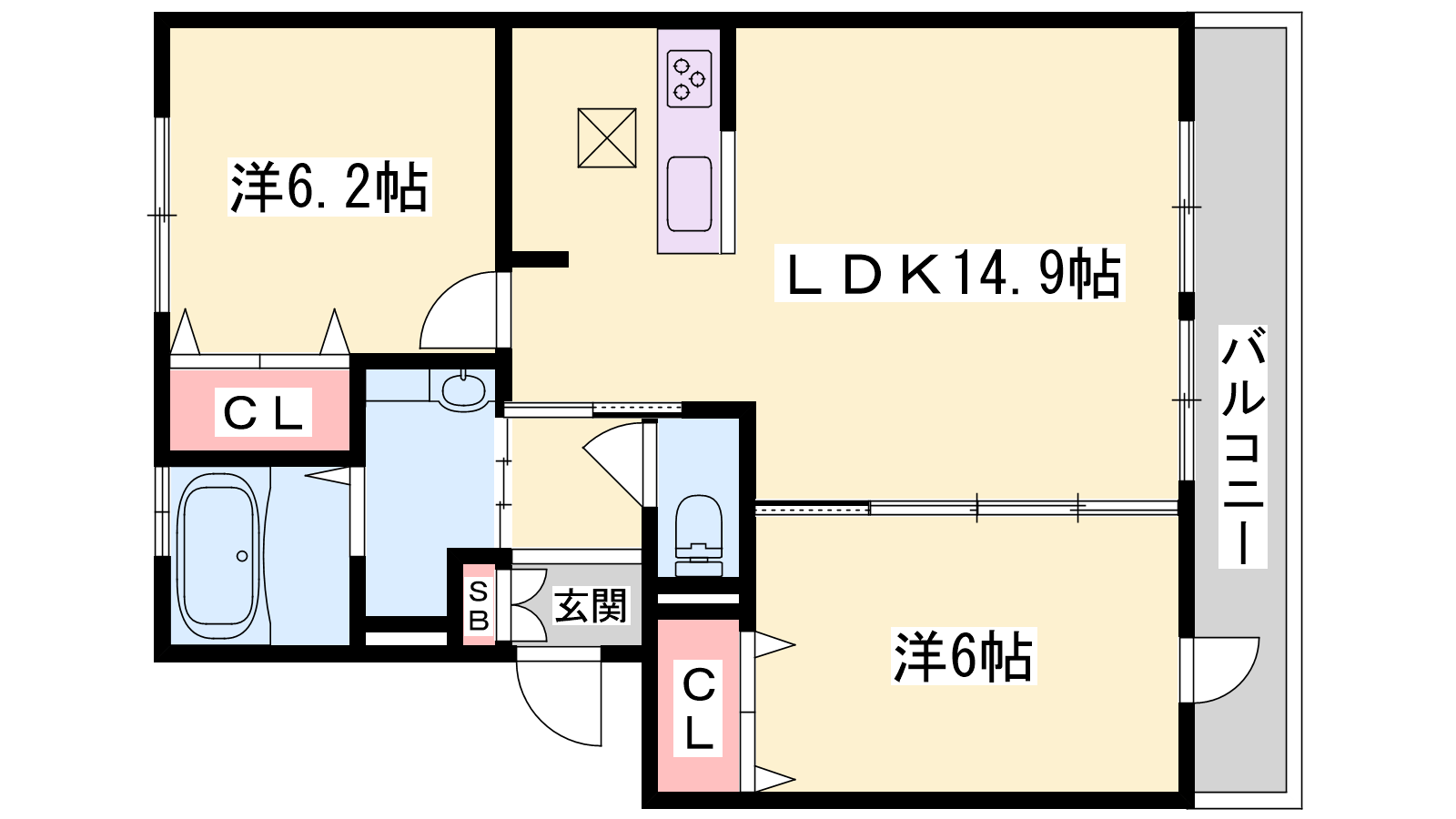 - LDK14.9帖、洋室6.2帖、洋室6帖