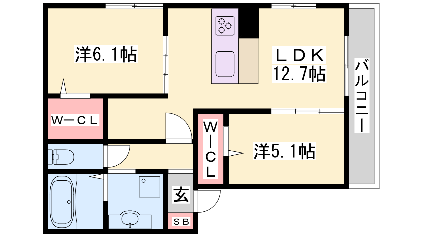 - LDK12.7帖、洋室6.1帖、洋室5.1帖
