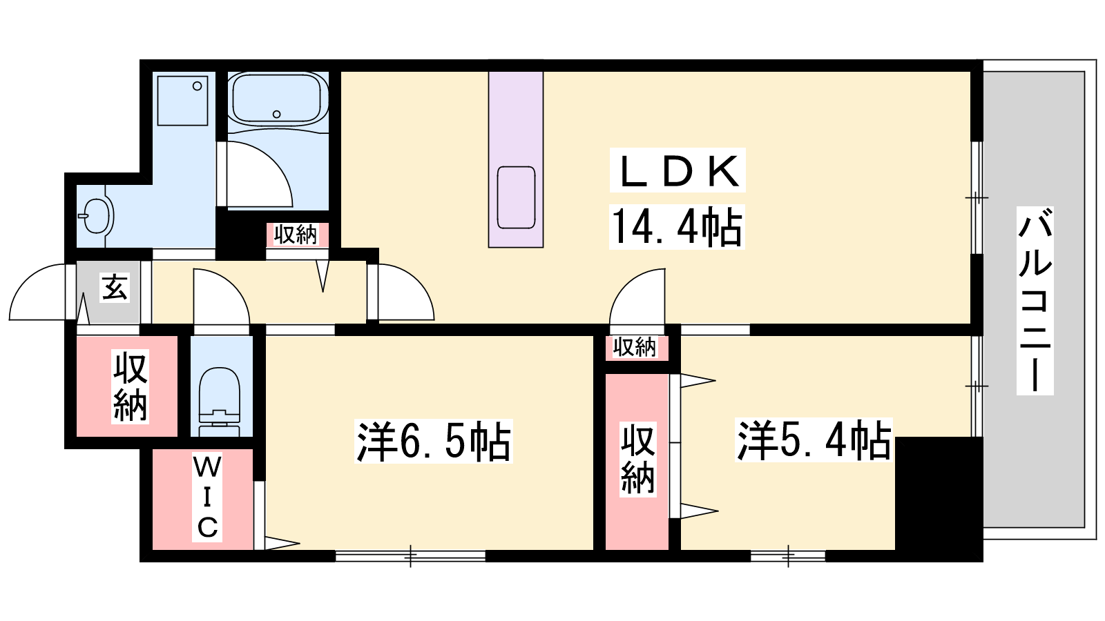 - LDK14.4帖、洋室6.5帖、洋室5.4帖