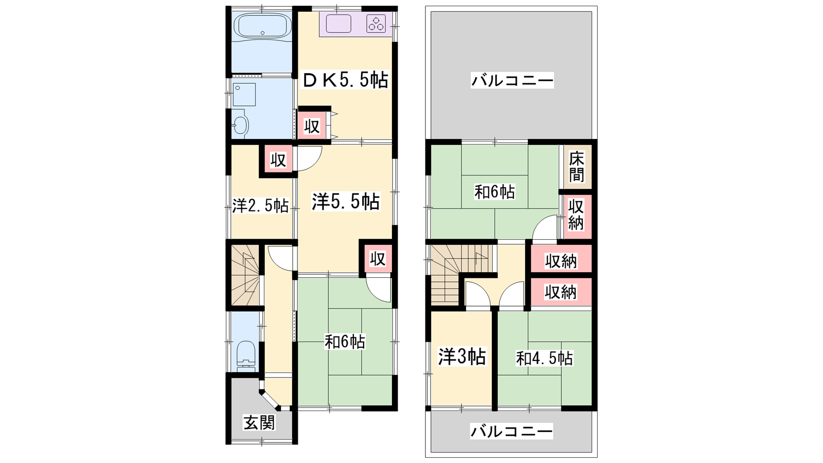 - DK5.5帖、洋室5.5帖、洋室3帖、洋室2.5帖、和室6帖、和室6帖、和室4.5帖