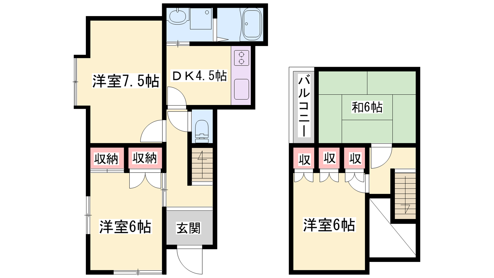 - DK4.5帖、洋室7.5帖、洋室6帖、洋室6帖、和室6帖