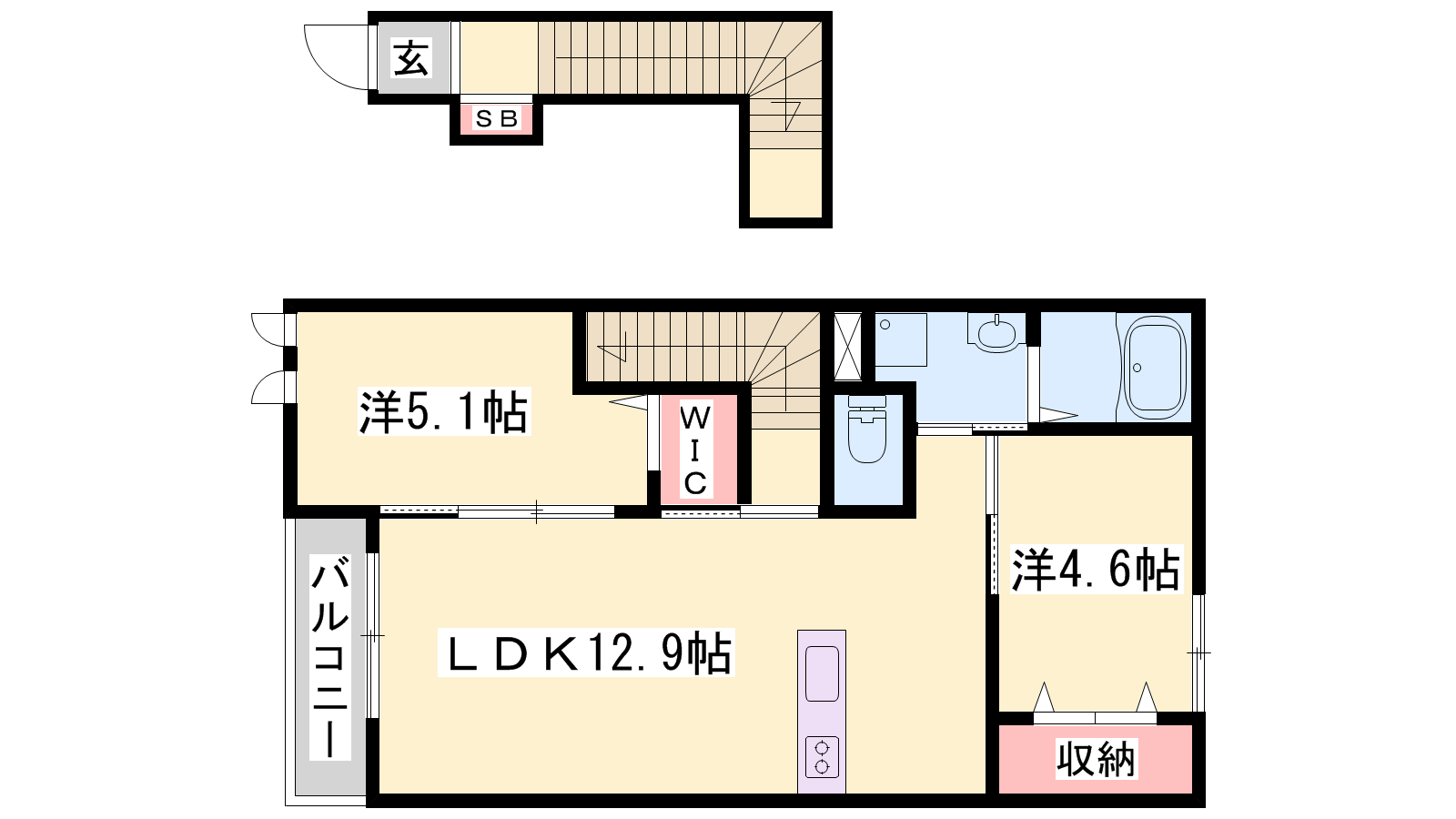 - LDK12.9帖、洋室5.1帖、洋室4.6帖