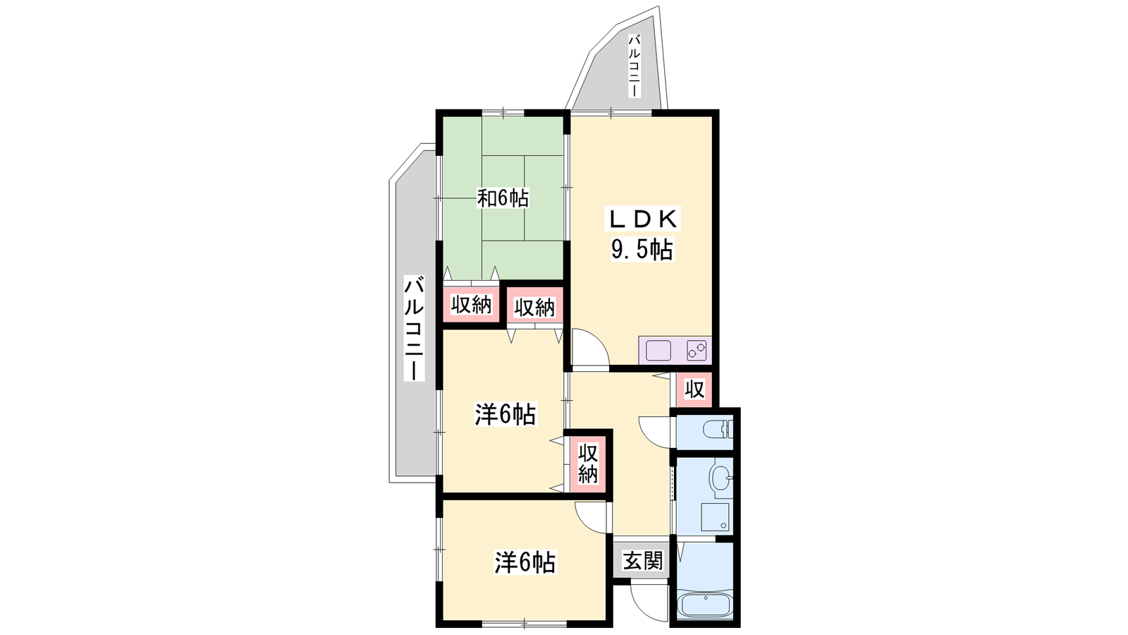 - LDK9.5帖、洋室6帖、和室6帖、和室6帖