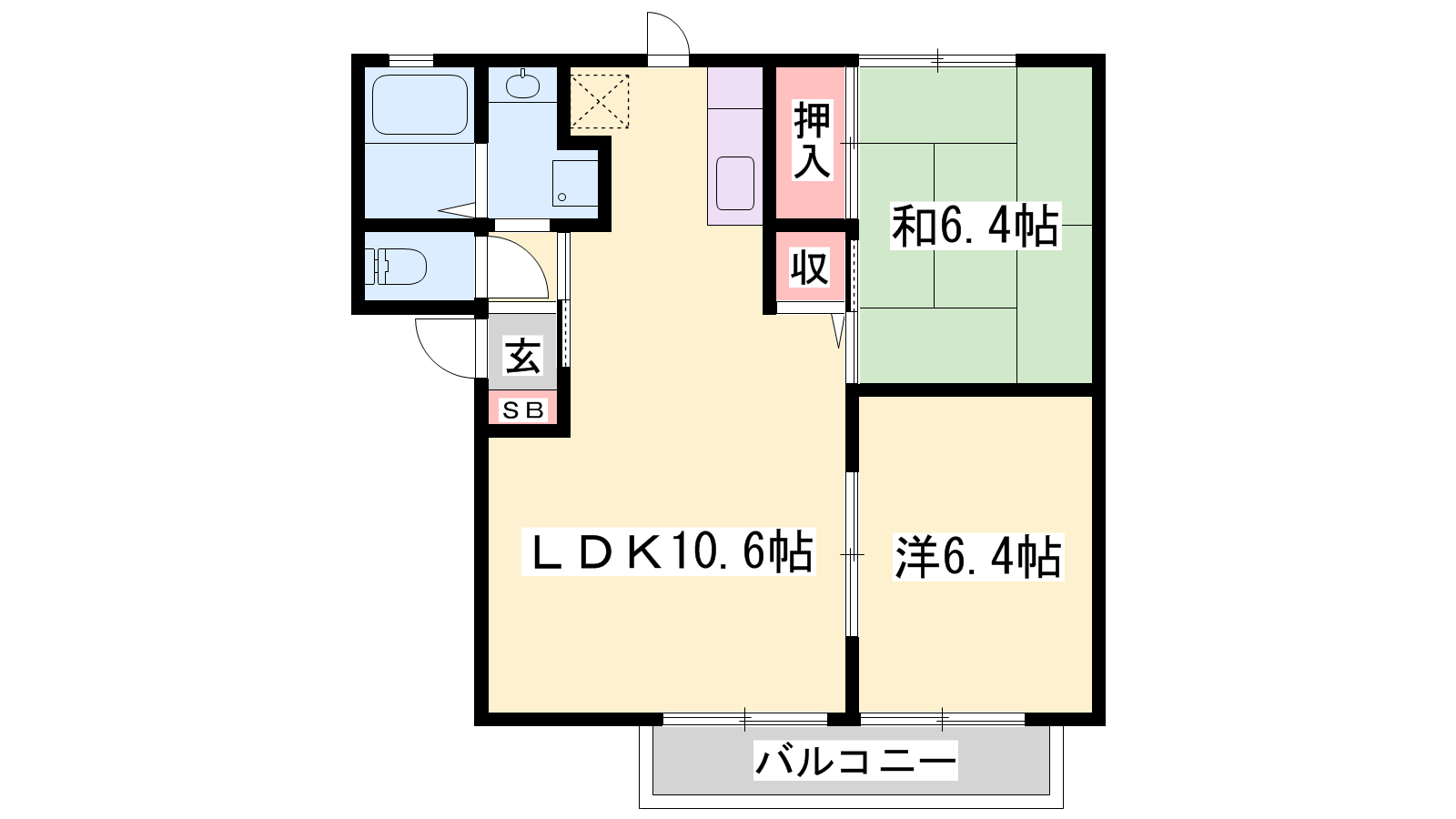 - LDK10.6帖、洋室6.4帖、和室6.4帖