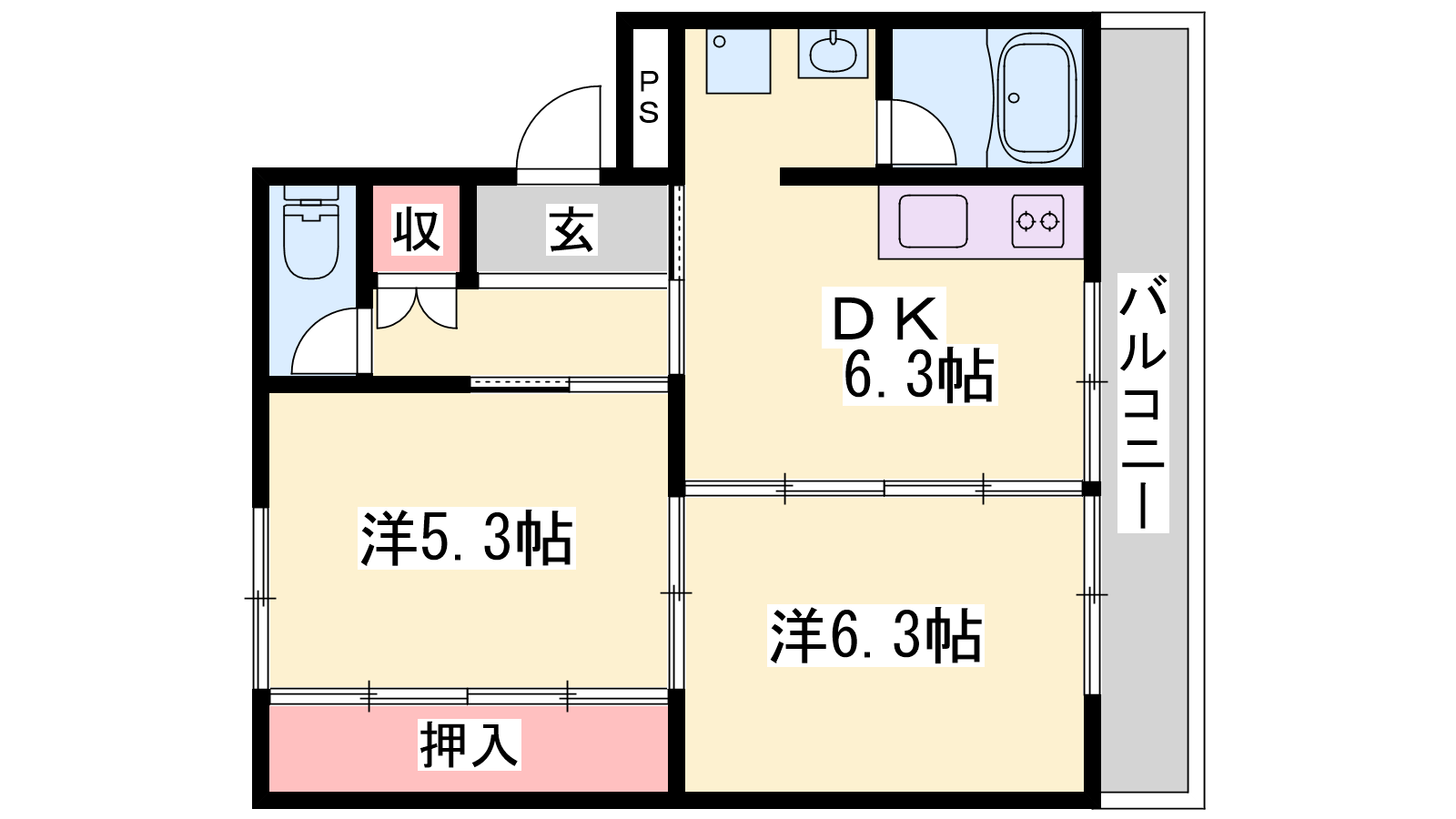 - DK6.3帖、洋室6.3帖、洋室5.3帖