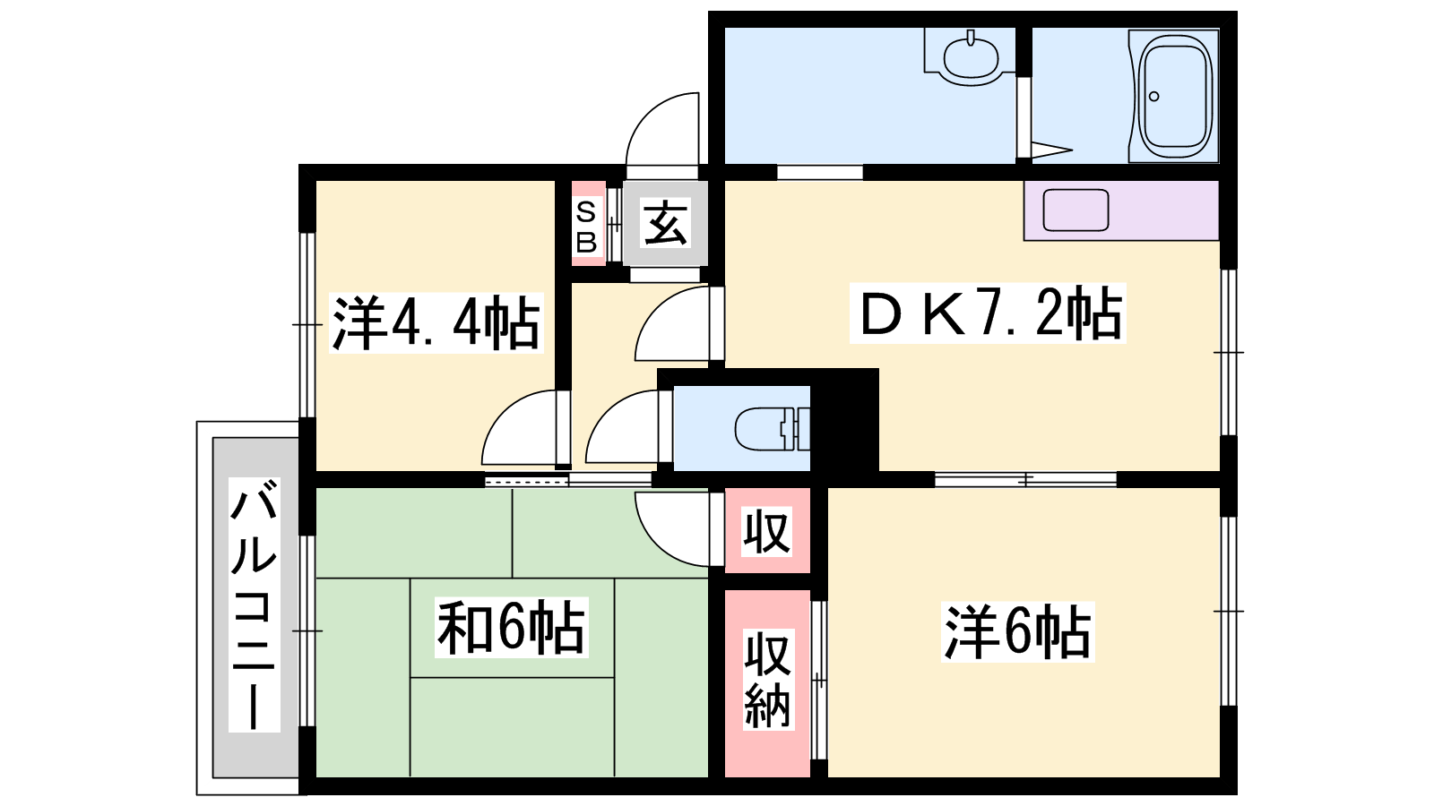 - DK7.2帖、洋室6帖、和室6帖、洋室4.4帖