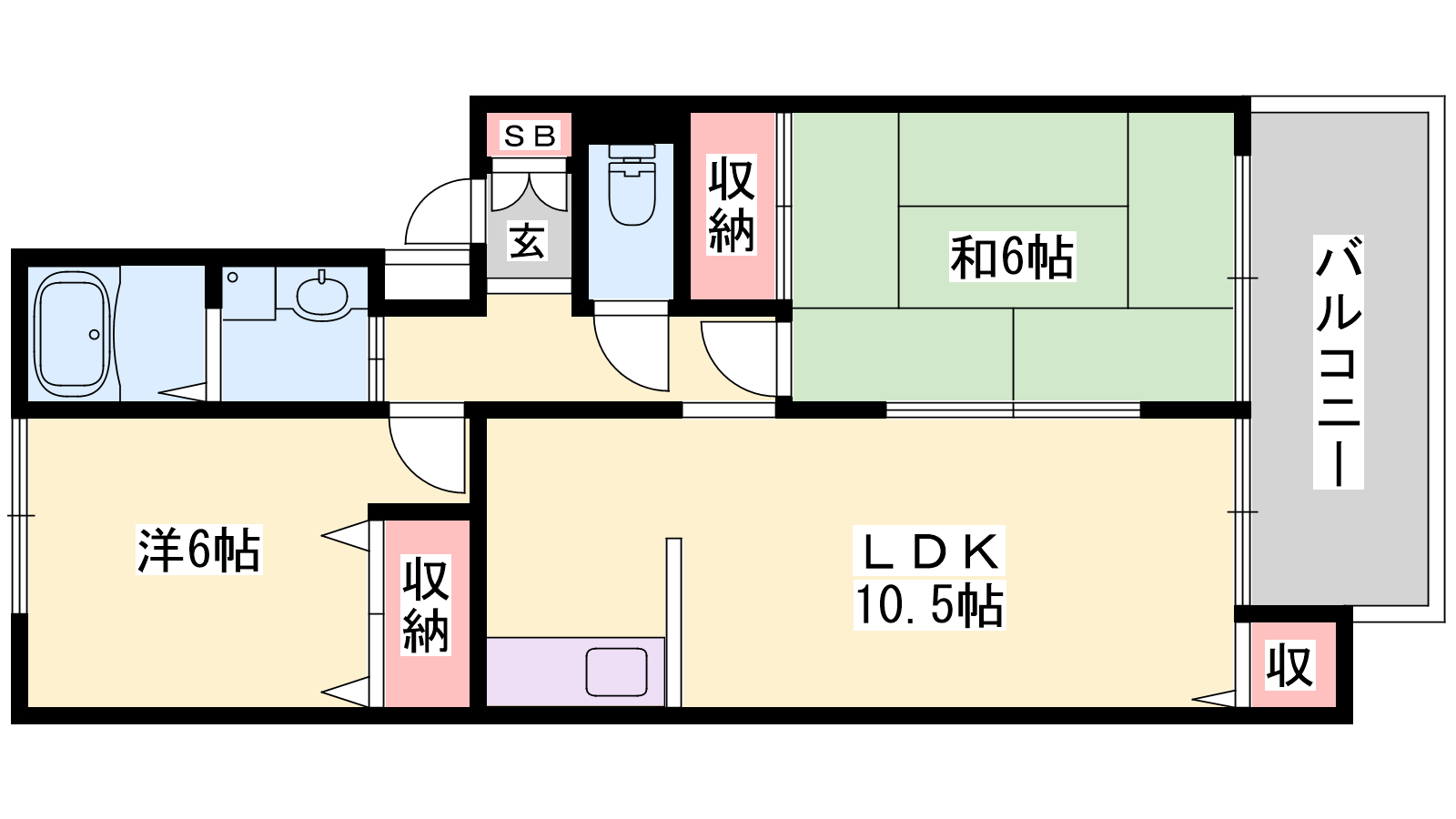 - LDK10.5帖、洋室6帖、和室6帖