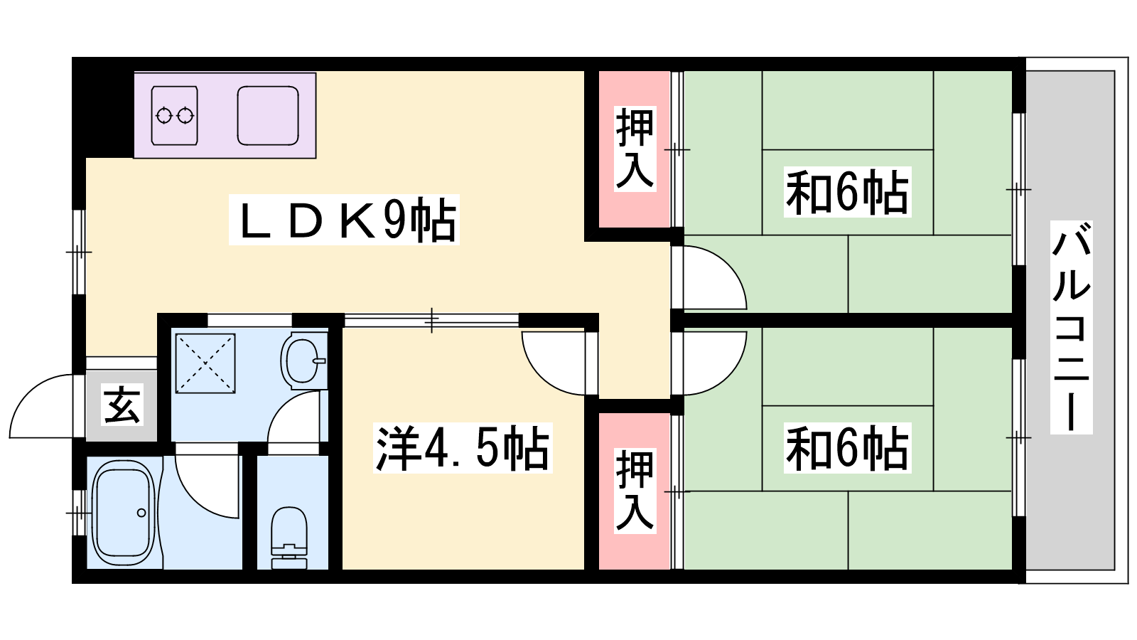 - LDK9帖、洋室4.5帖、和室6帖、和室6帖
