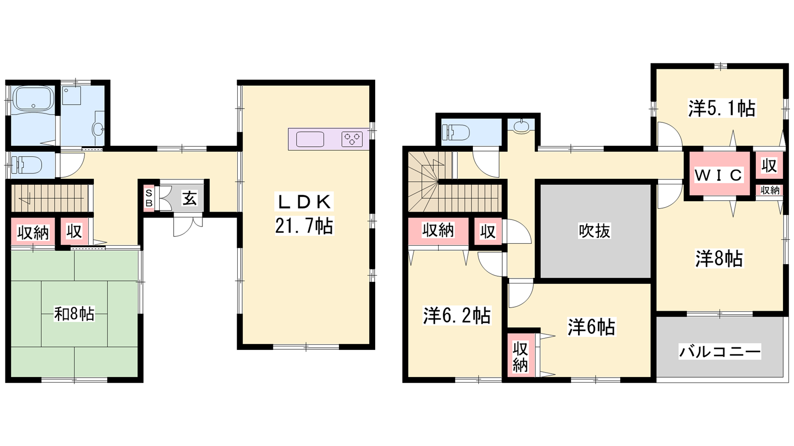 - LDK21.7帖、洋室8帖、洋室6.2帖、洋室6帖、洋室5.1帖、和室8帖