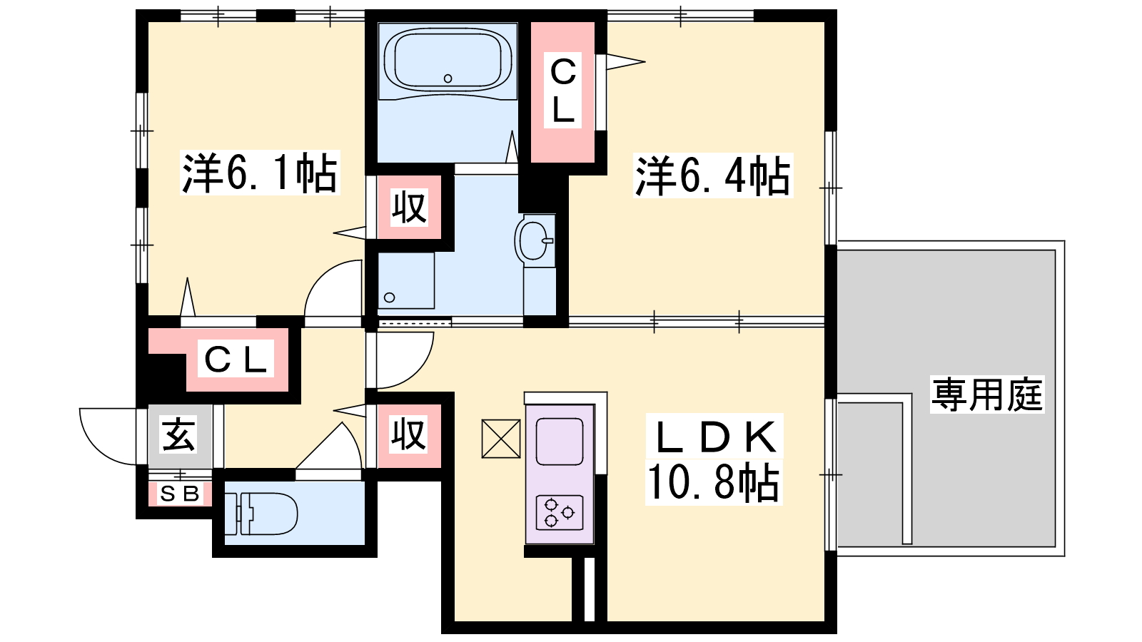 - LDK10.8帖、洋室6.4帖、洋室6.1帖