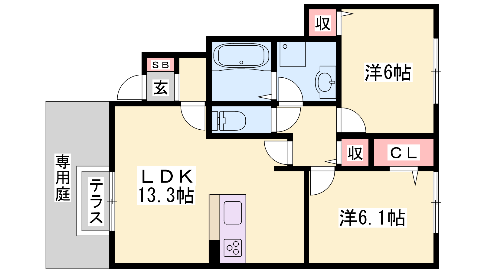 - LDK13.3帖、洋室6.1帖、洋室6帖