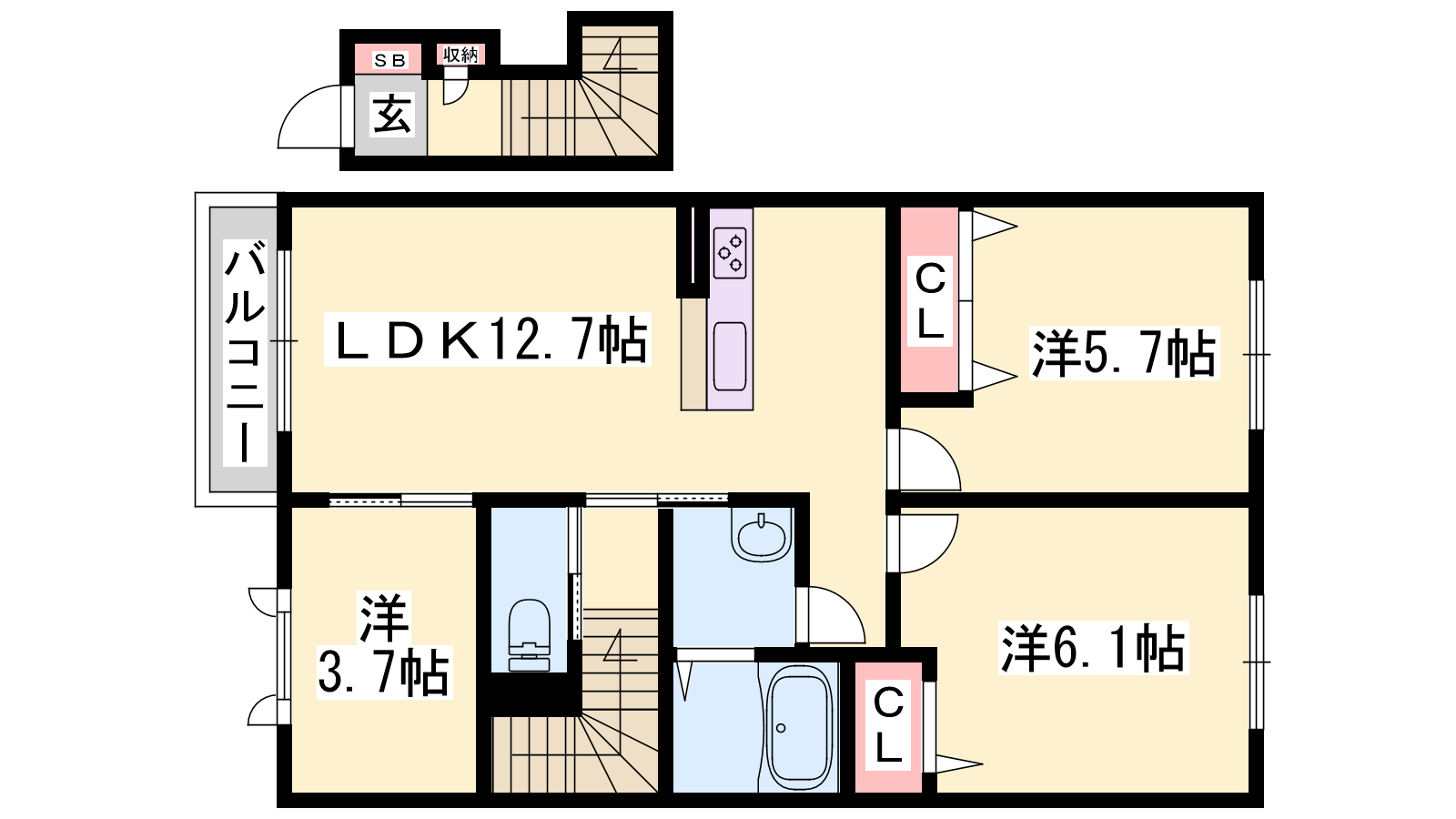 - LDK12.7帖、洋室6.1帖、洋室5.7帖、洋室3.7帖