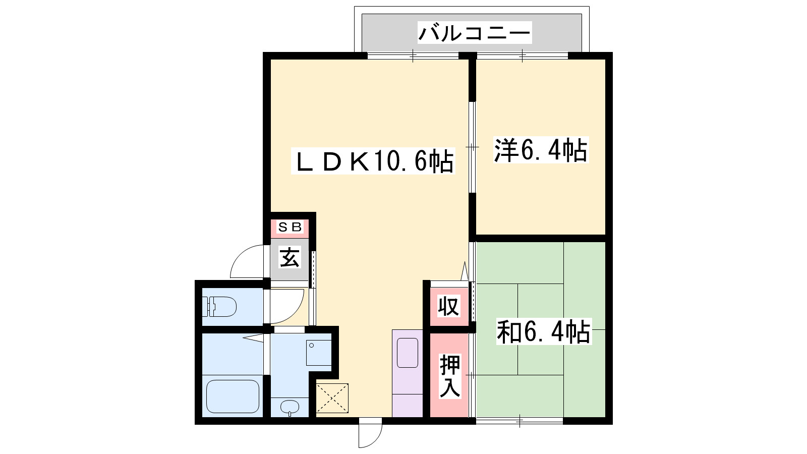 - LDK10.6帖、洋室6.4帖、和室6.4帖