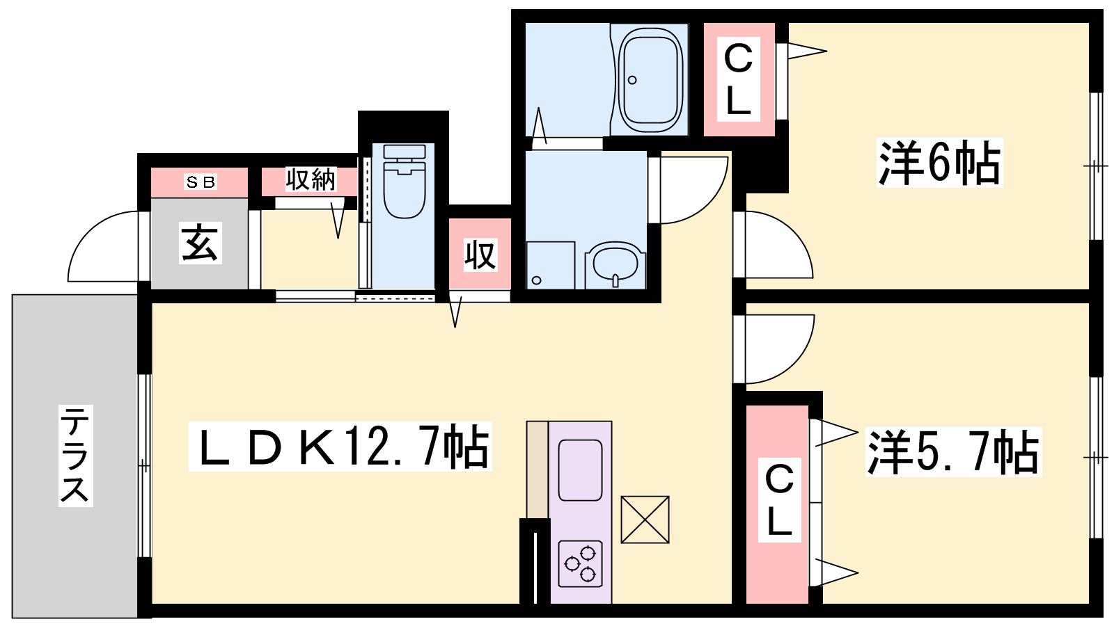 - LDK12.7帖、洋室6帖、洋室5.7帖