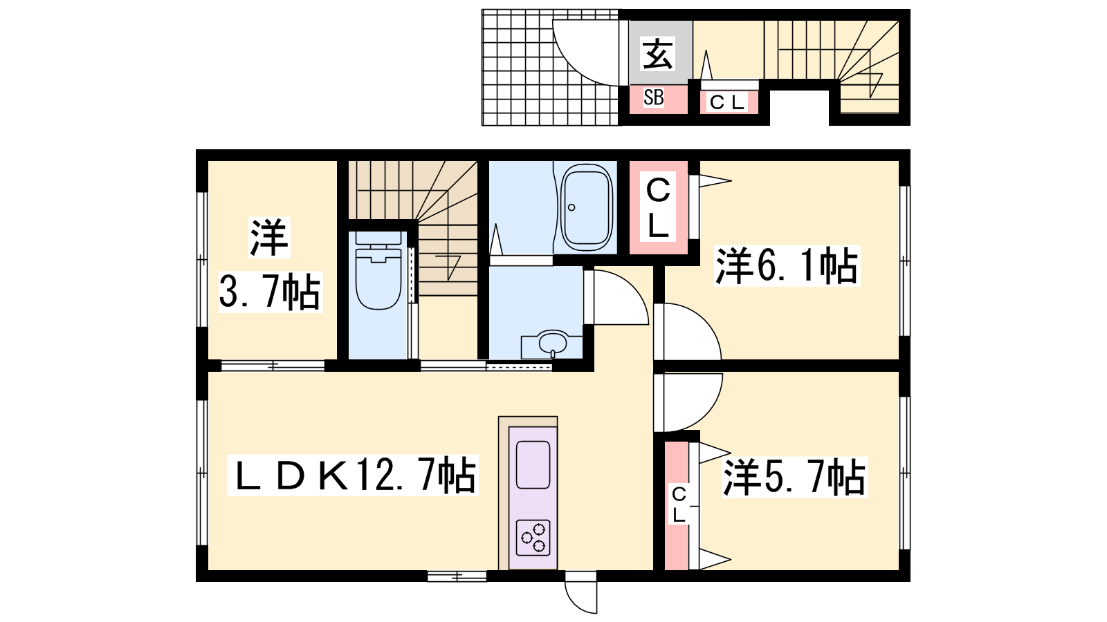 - LDK12.7帖、洋室6.1帖、洋室5.7帖、洋室3.7帖
