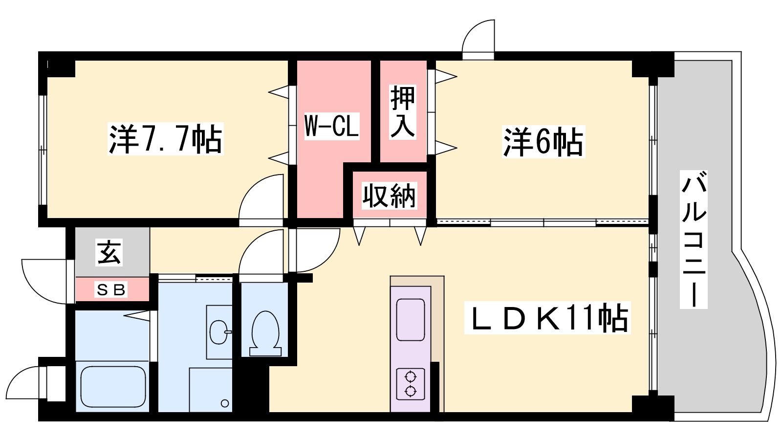 - LDK11帖、洋室7.7帖、洋室6帖