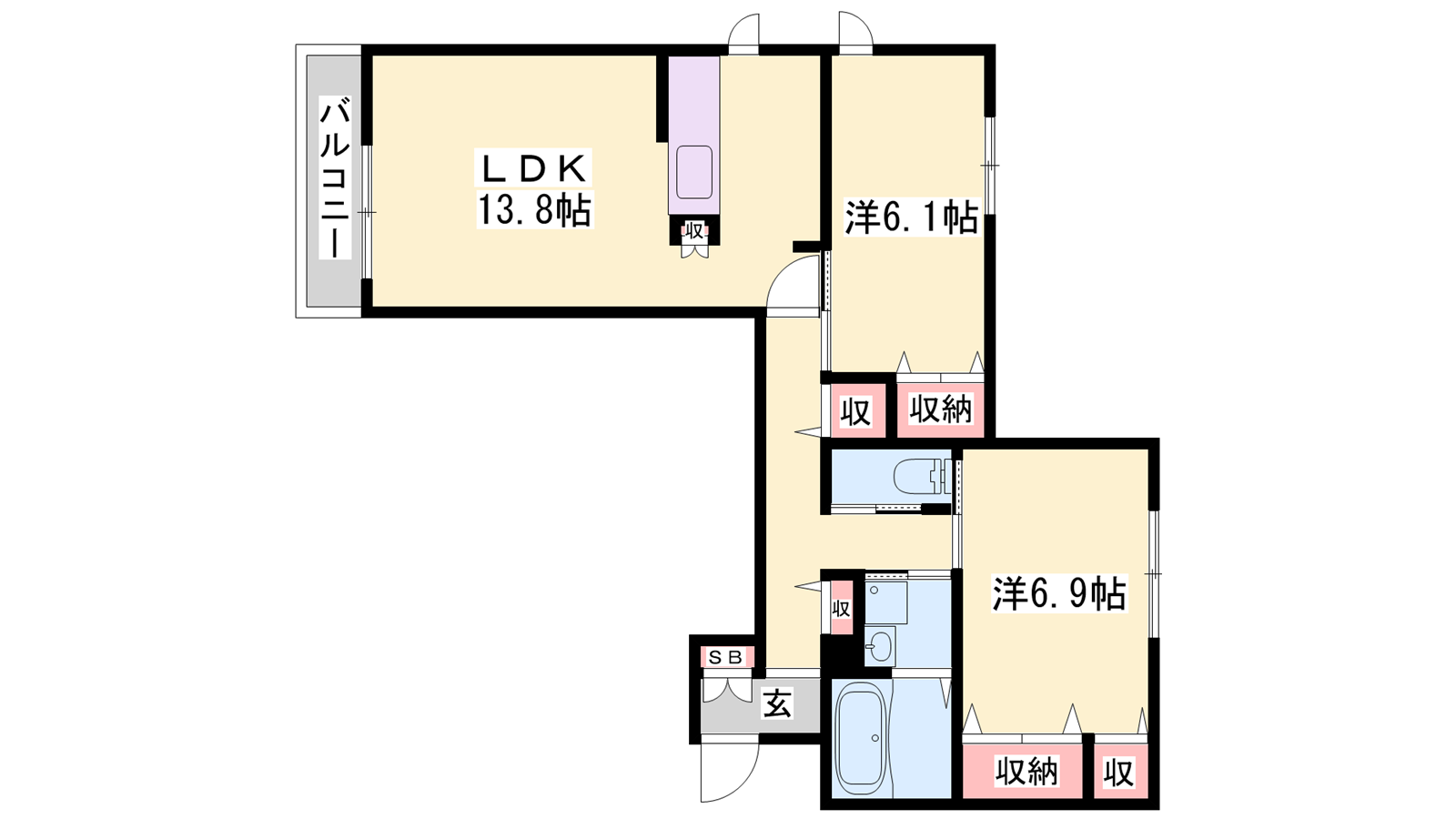 - LDK13.8帖、洋室6.9帖、洋室6.1帖