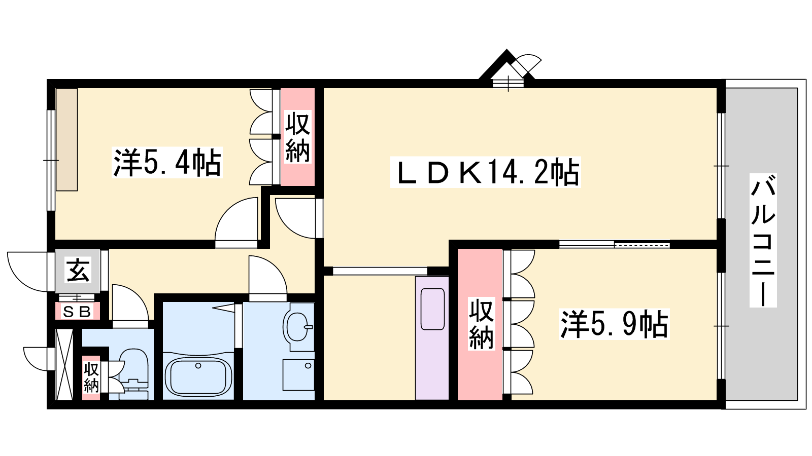 - LDK14.2帖、洋室5.9帖、洋室5.4帖