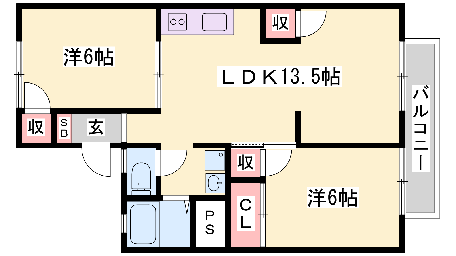 - LDK13.5帖、洋室6帖、洋室6帖
