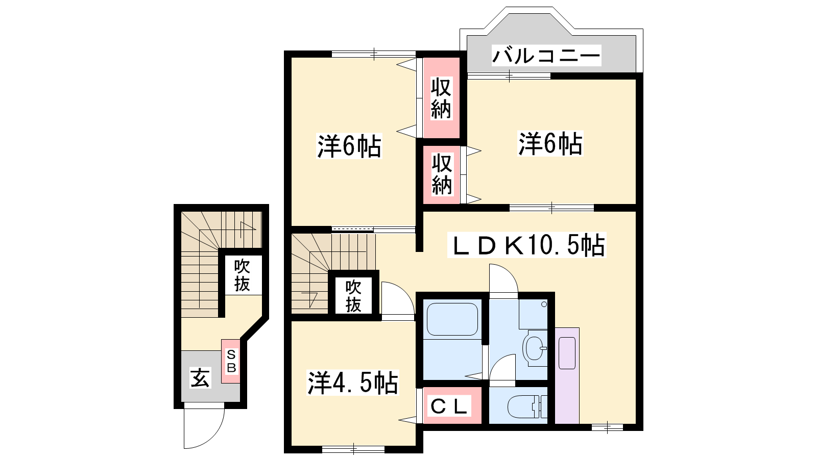 - LDK10.5帖、洋室6帖、洋室4.5帖、和室6帖