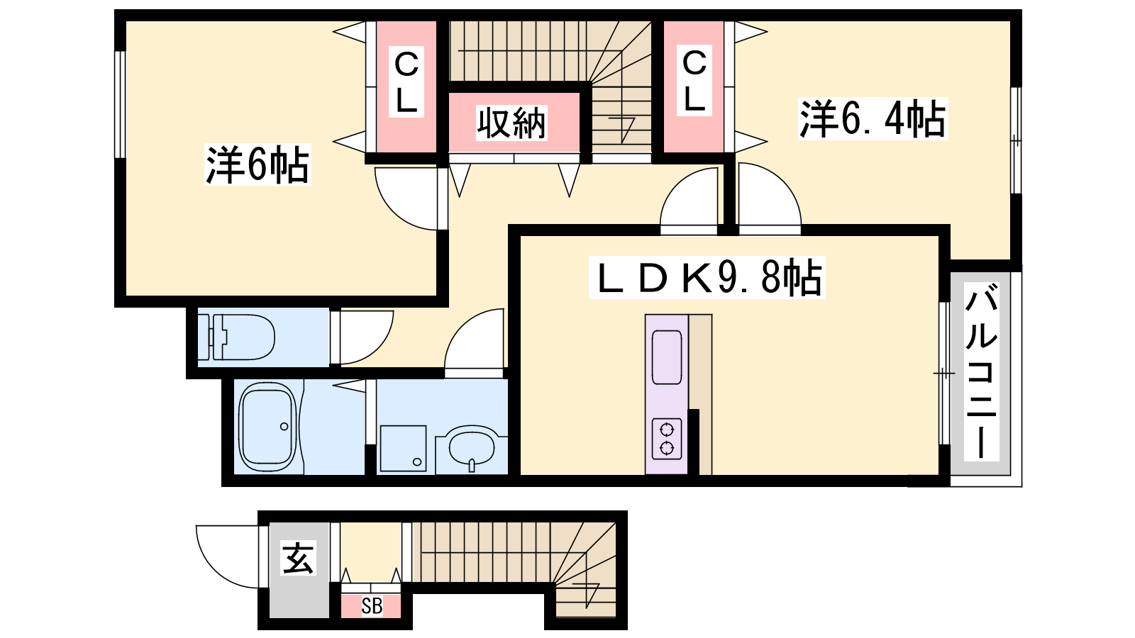 - LDK9.8帖、洋室6.4帖、洋室6帖