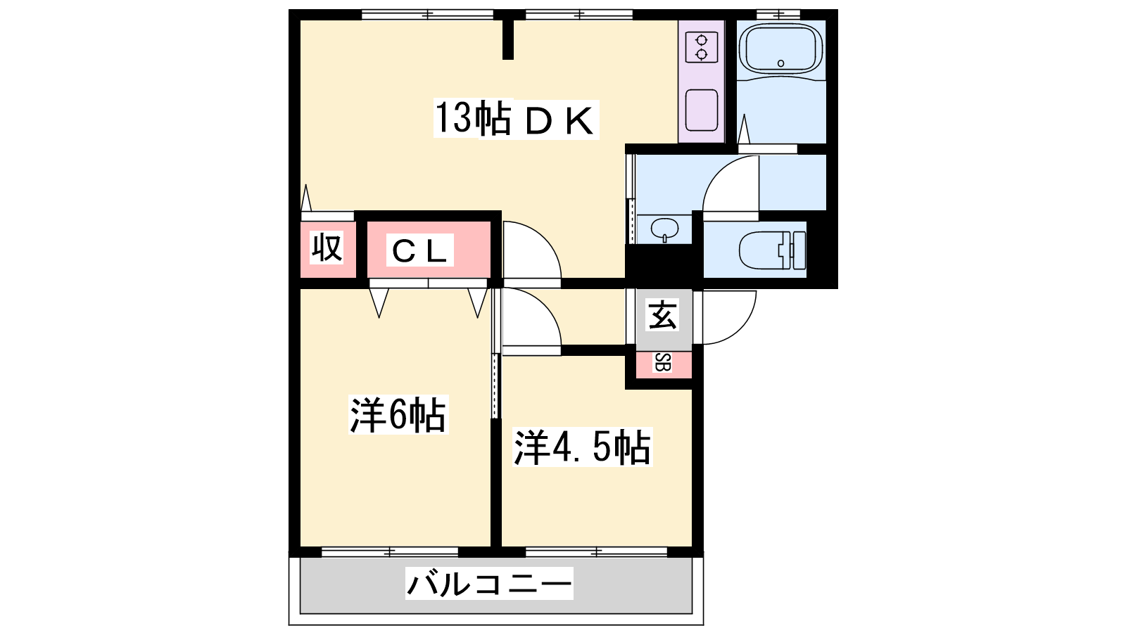 - LDK13帖、洋室6帖、洋室4.5帖