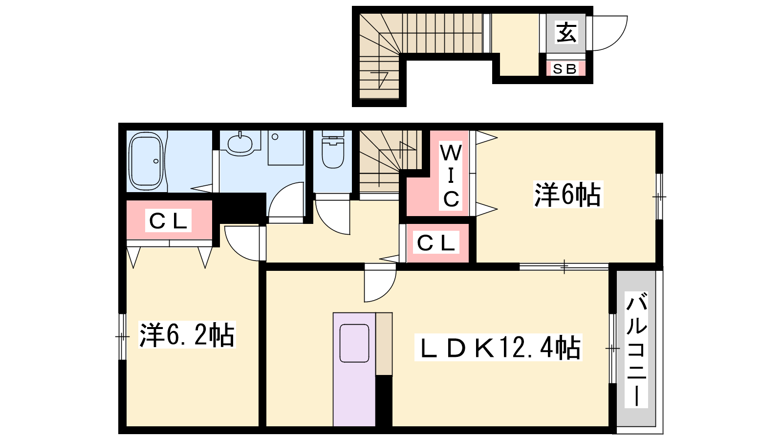 - LDK12.4帖、洋室6.2帖、洋室6帖