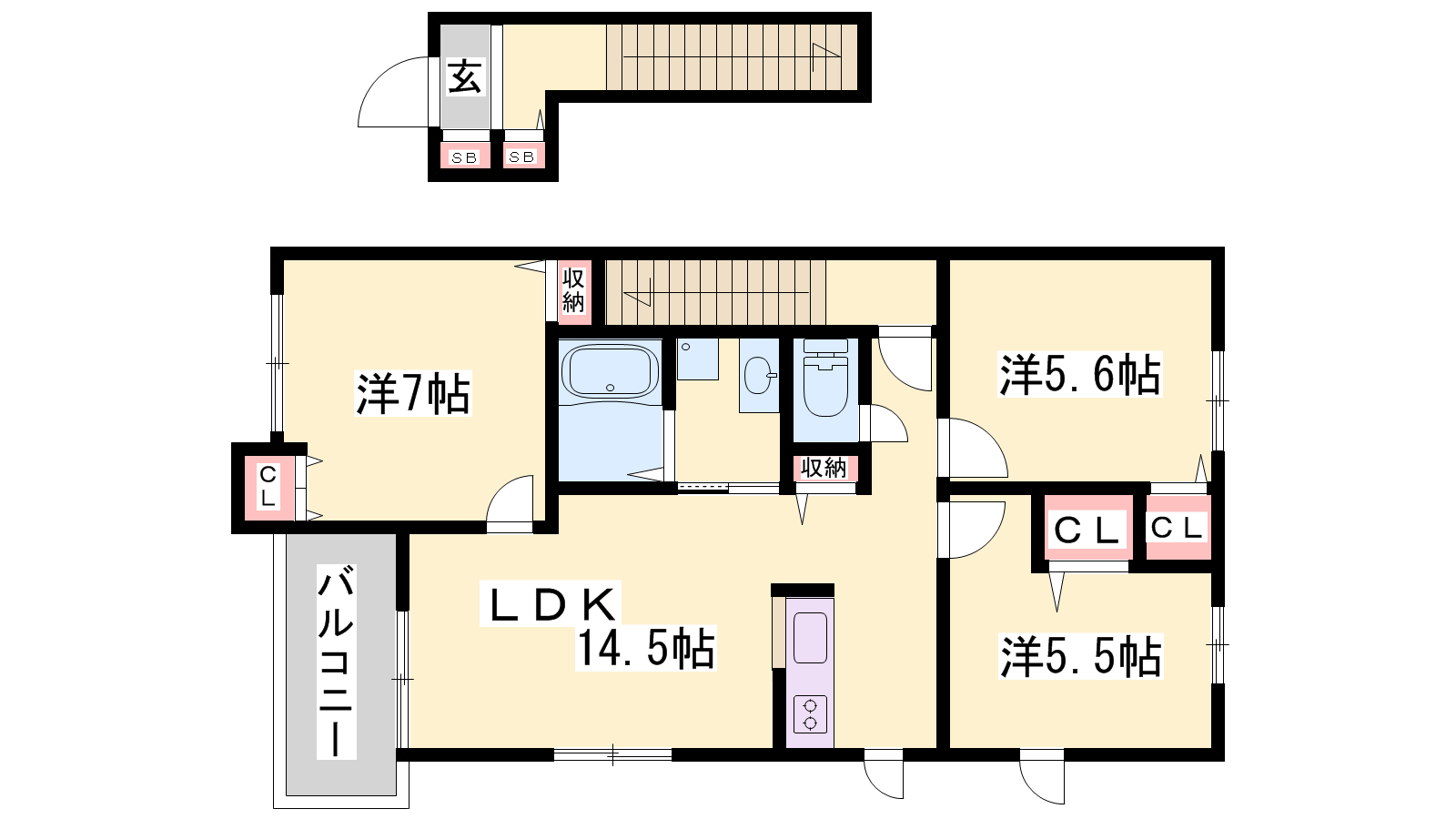 - LDK14.5帖、洋室7帖、洋室5.6帖、洋室5.5帖