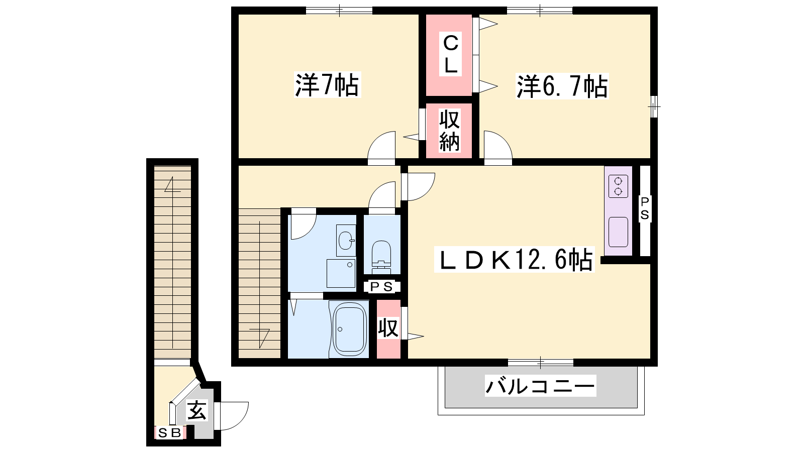- LDK12.6帖、洋室7帖、洋室6.7帖