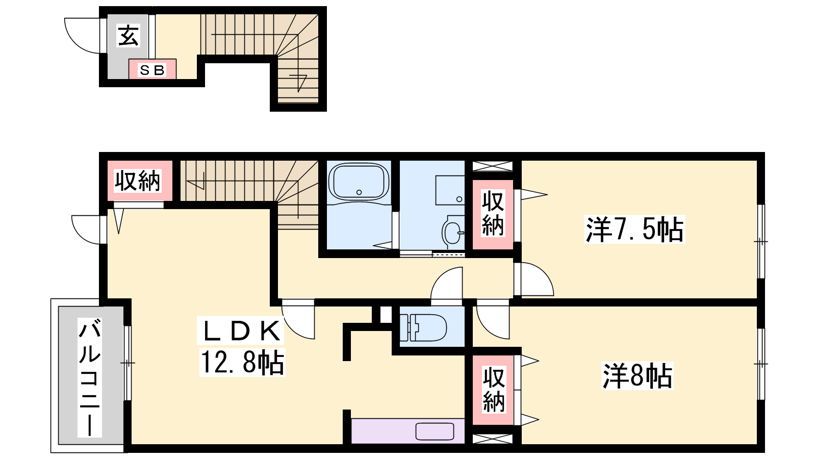 - LDK12.8帖、洋室8帖、洋室7.5帖
