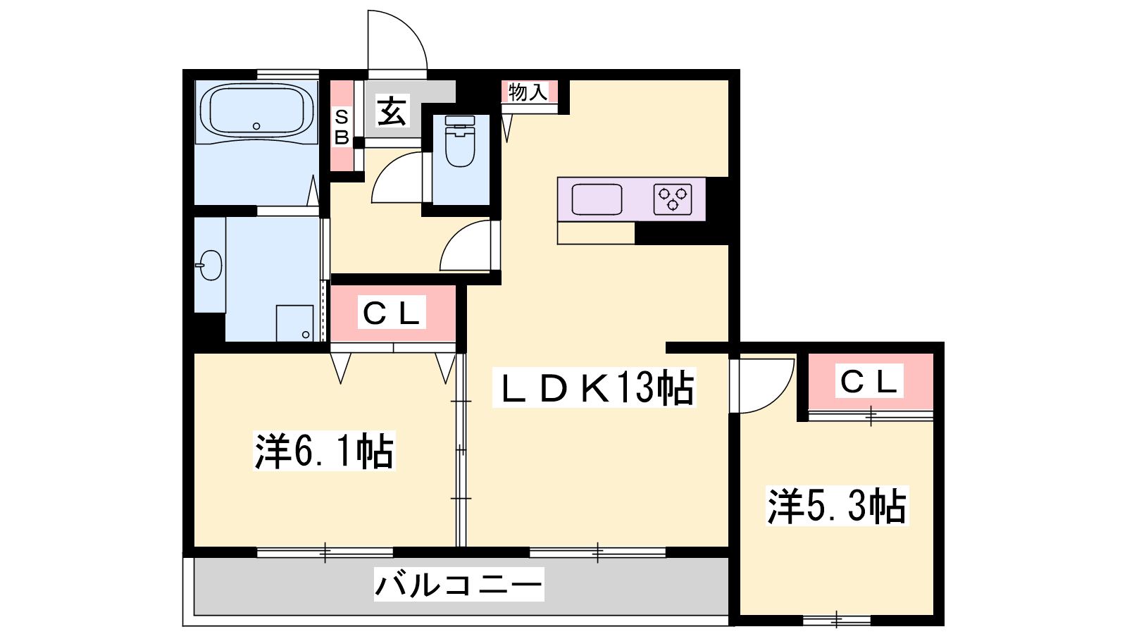 - LDK13帖、洋室6.1帖、洋室5.3帖
