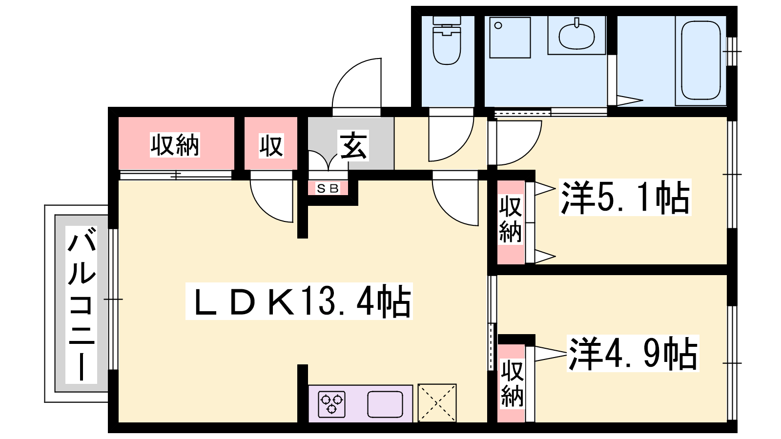 - LDK13.5帖、洋室5.1帖、洋室4.9帖