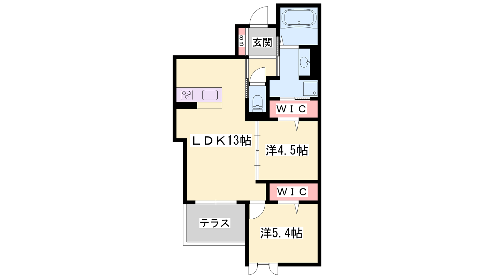 - LDK13帖、洋室5.4帖、洋室4.5帖