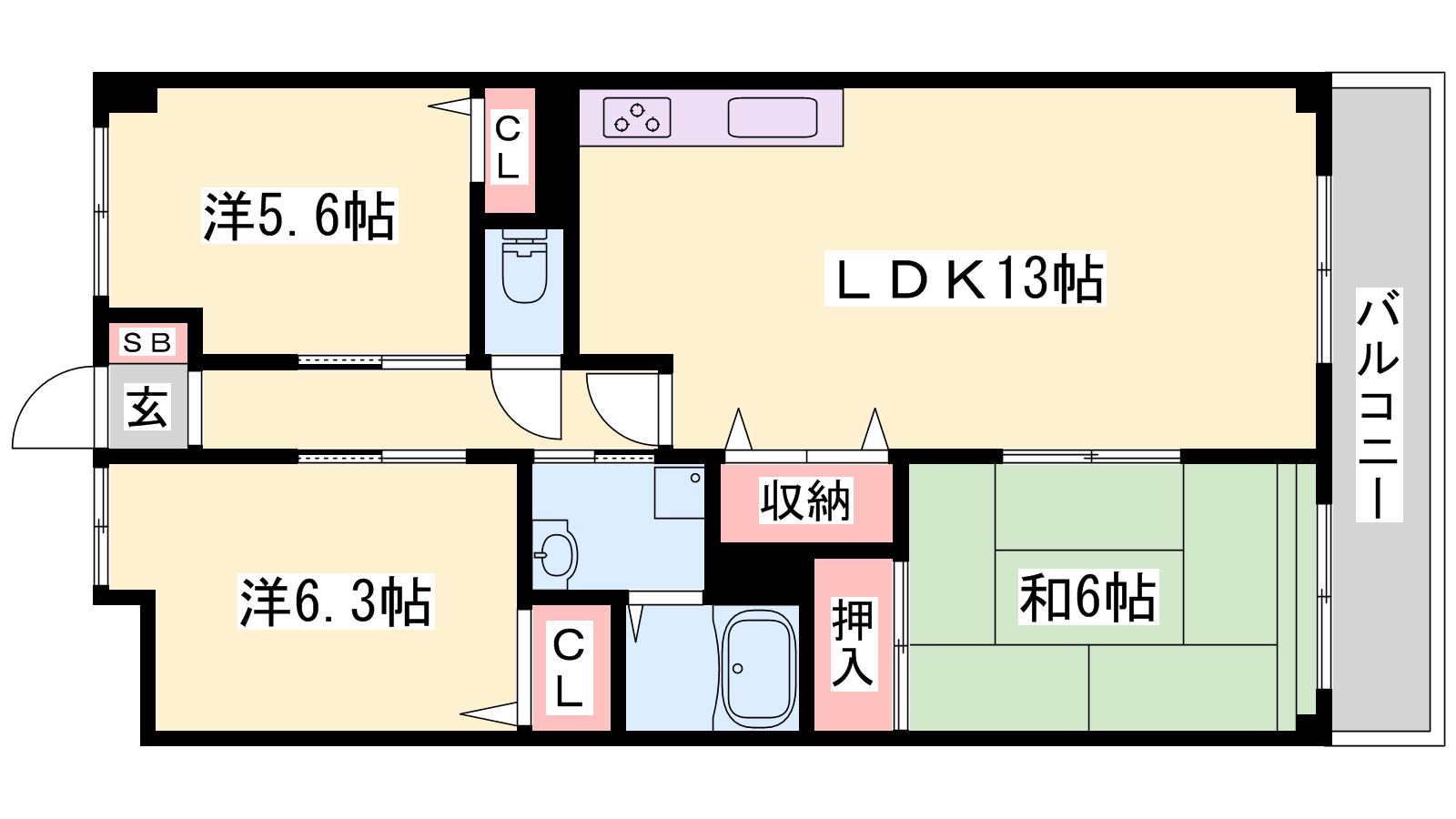 - LDK13帖、洋室6.3帖、洋室5.6帖、和室6帖