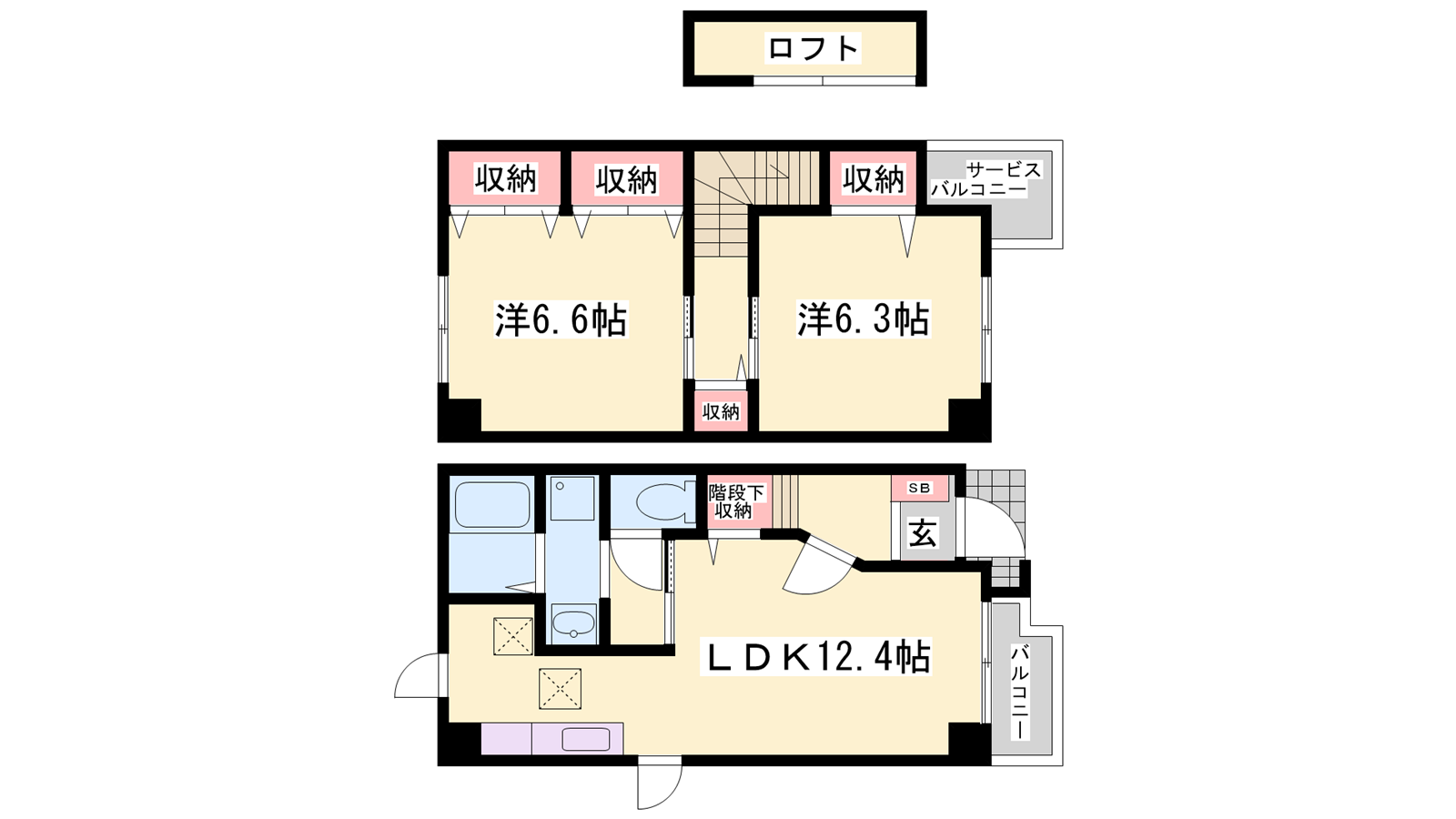 - LDK12.4帖、洋室6.6帖、洋室6.3帖