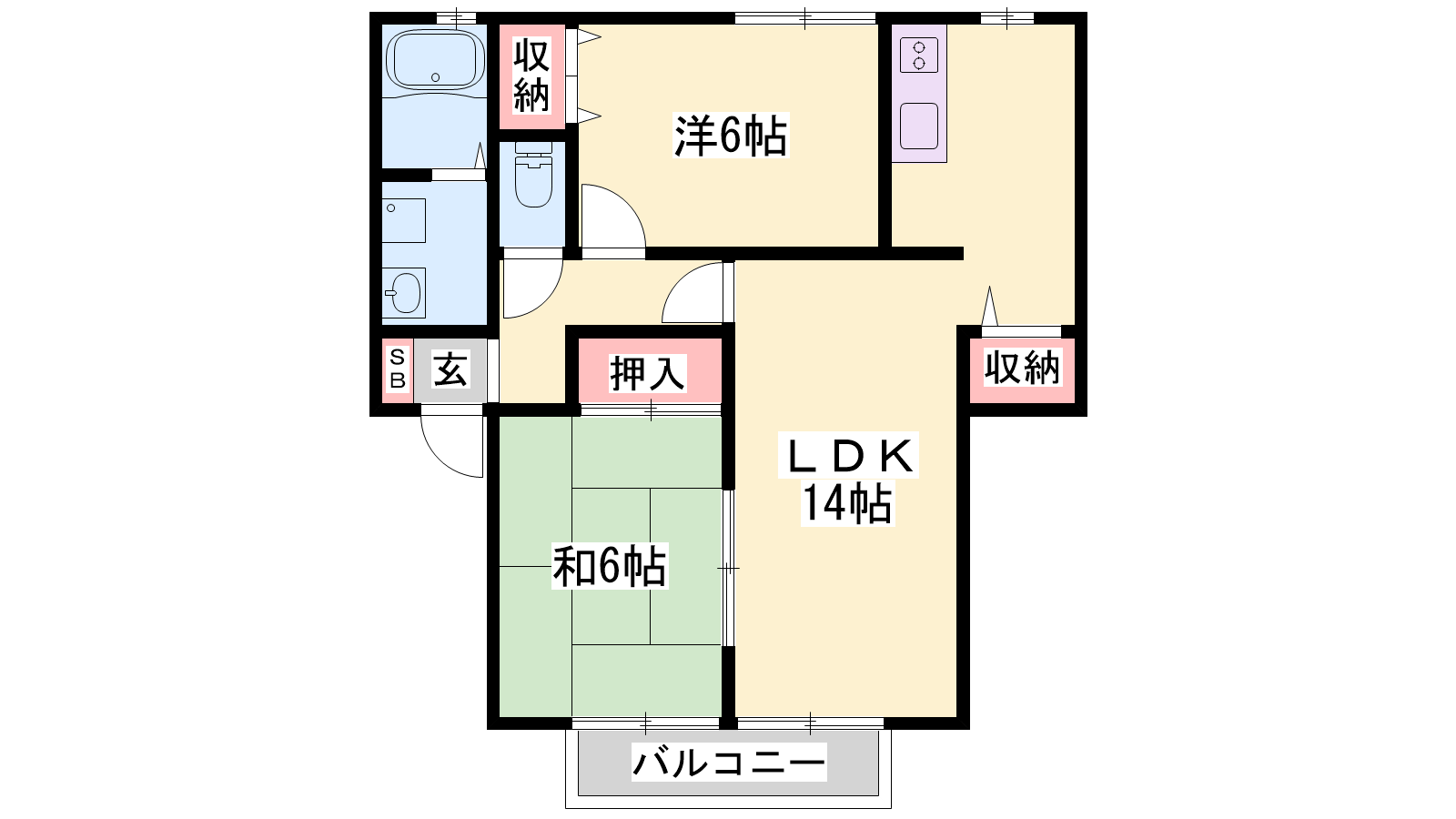 - LDK14帖、洋室6帖、和室6帖
