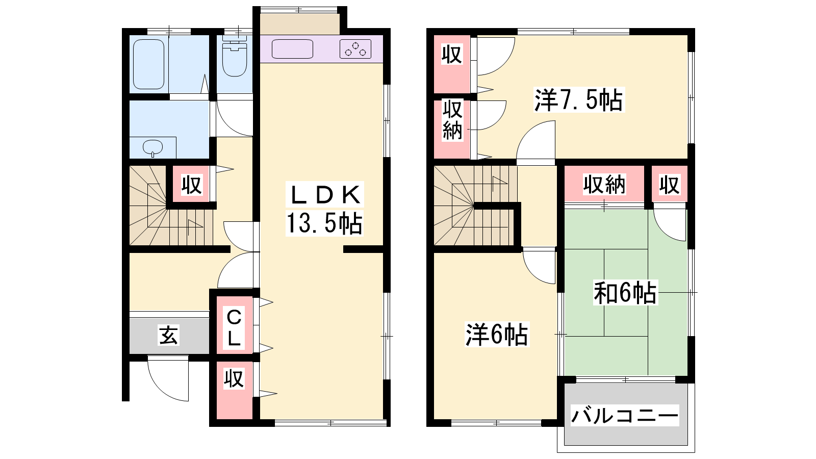 - LDK13.5帖、洋室6帖、和室4.5帖、洋室7.5帖