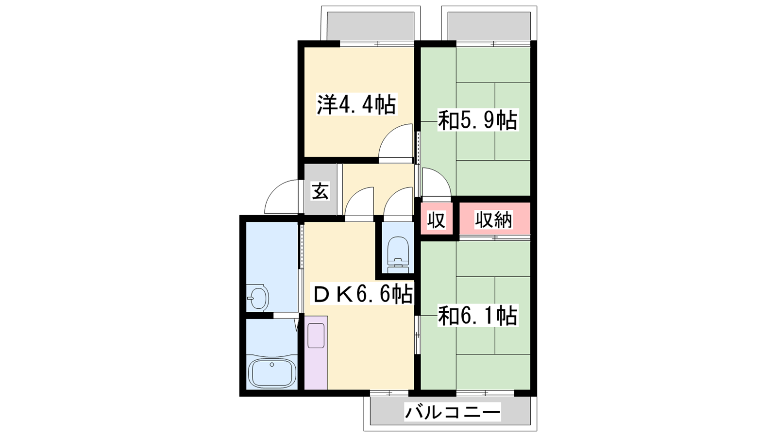 - DK6.6帖、和室6.1帖、和室5.9帖、洋室4.4帖