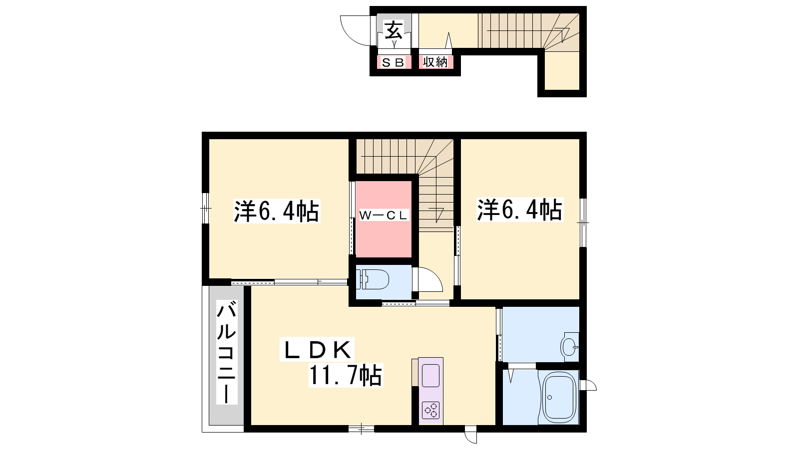 - LDK11.7帖、洋室6.4帖、洋室6.4帖